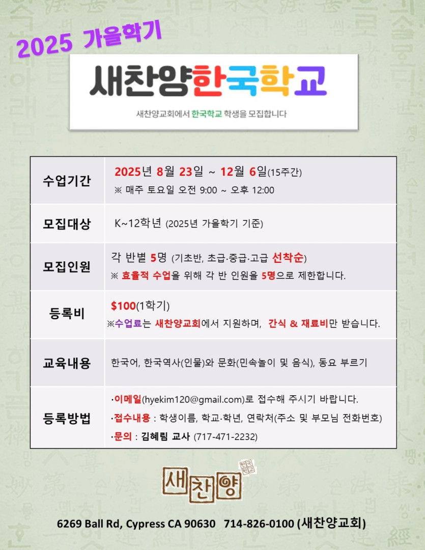 [2025] 새찬양한국학교 가을학기 안내