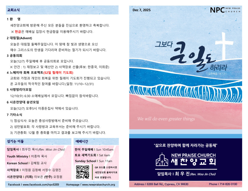 December 06, 2025 . 새찬양교회 [120725] 주일예배 주보